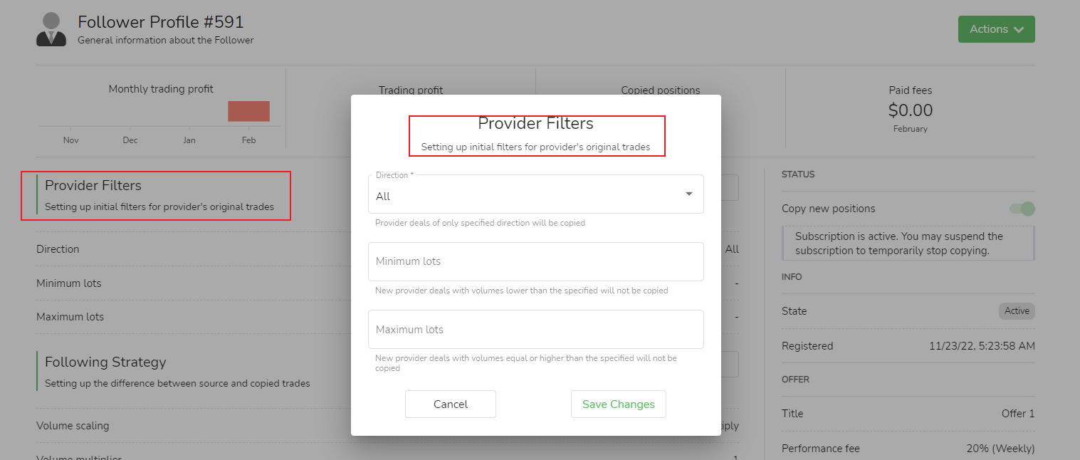 يعتمد حجم تداول النسخ على الرصيد الحالي أو حقوق الملكية لحساب التابع. يمكن للمتابعين تعديل حجم تداول النسخ وفقًا لرصيد الحساب الجاري أو صافي القيمة للتحكم في مخاطر النسخ