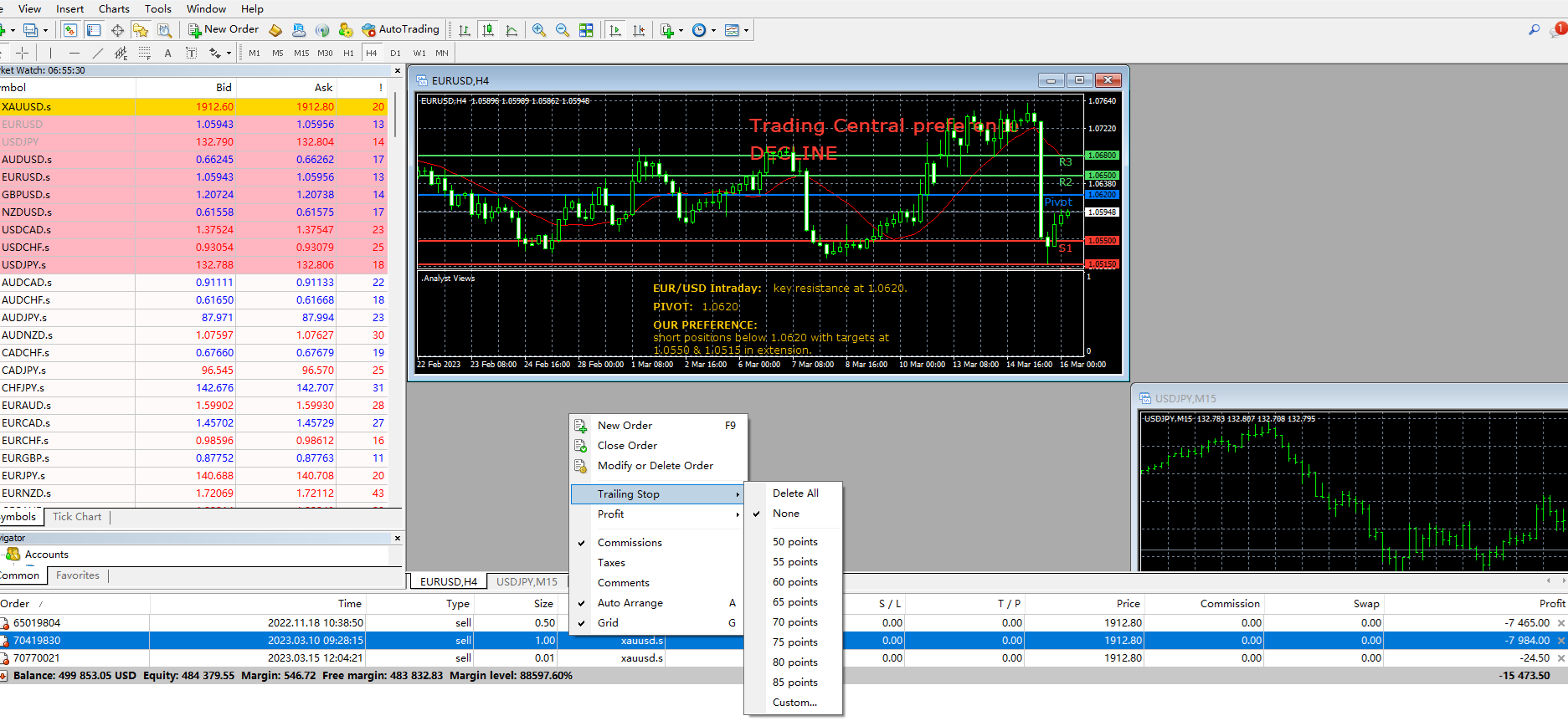 الرجاء النقر فوق "تداول" في شريط المحطة لعرض الطلبات الحالية ، ثم انقر بزر الماوس الأيمن لتحديد أمر الحجز ، ثم انقر فوق "Trailing Stop" وحدد "مخصص" ، وقم بملء عدد نقاط الإيقاف المتحرك التي تريد تعيينها.