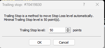 على سبيل المثال ، إذا كان سعر افتتاح عقد واحد هو 1.00000 لأمر طويل EURUSD ، فقم بتعيين وقف خسارة متحرك بمقدار 100 نقطة.عندما يخترق سعر اليورو مستوى 1.00100 ، سيتم تشغيل وقف الخسارة المتحرك. تراجع اليورو إلى 1.00100 ، سيتوقف الأمر عند تنفيذ 1.00100.
