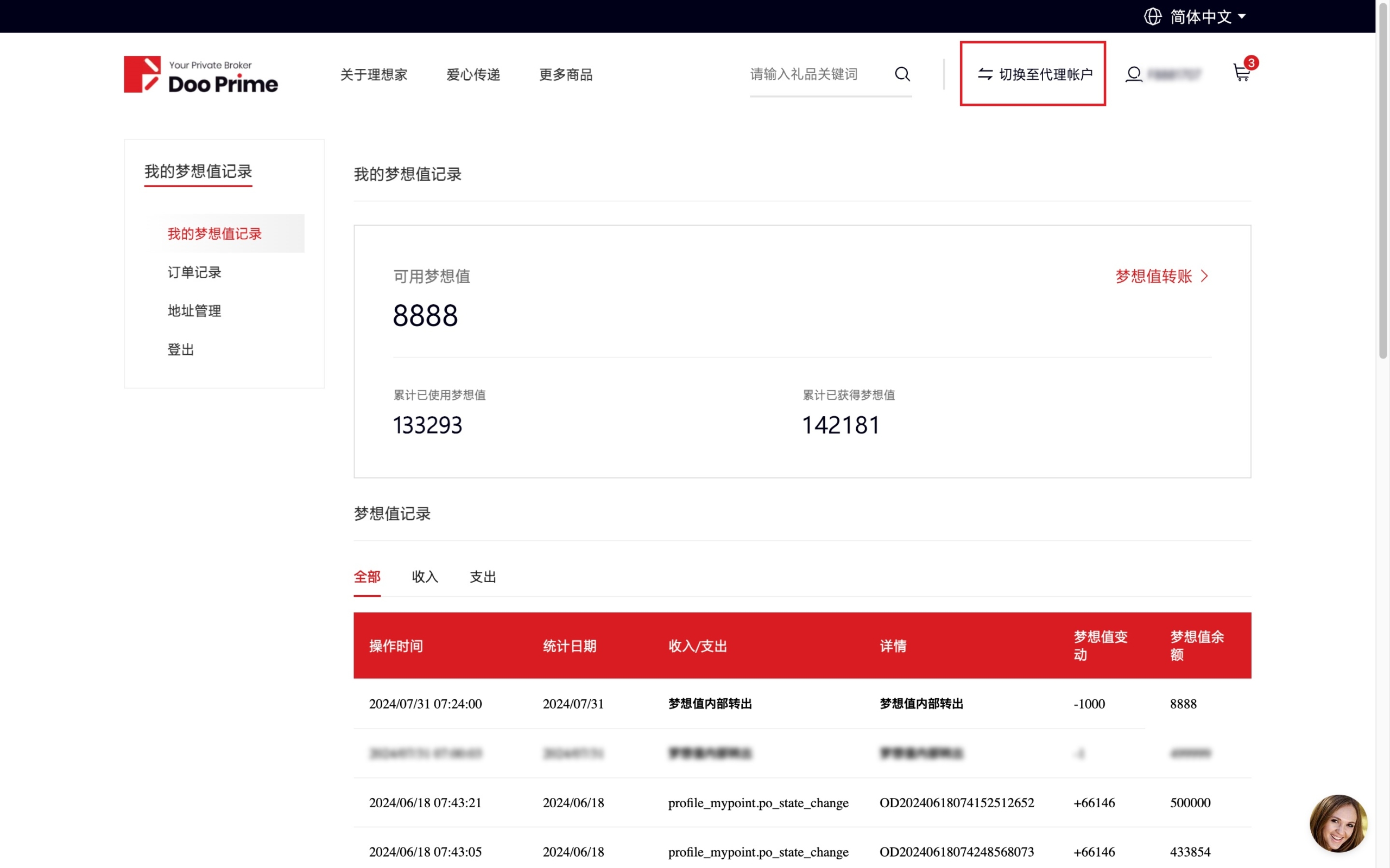 Switch the account role in the upper right corner of the navigation bar to view the points status of the account with the same name.