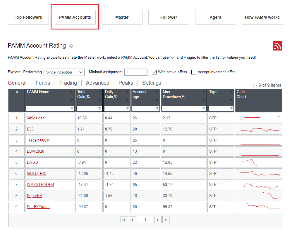 For more information and trading results of a master, click on their “PAMM Name” for analysis purposes. Parameters are divided into five groups: General, Funds, Trading, Advanced, Peaks, and Settings. Users may sort and apply filters to any column.