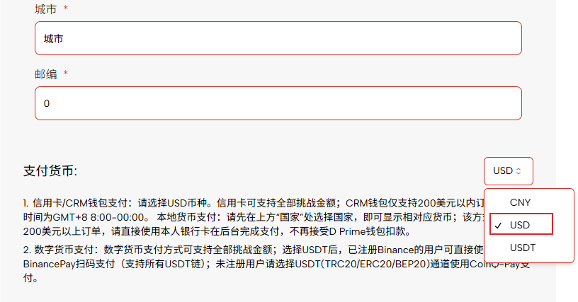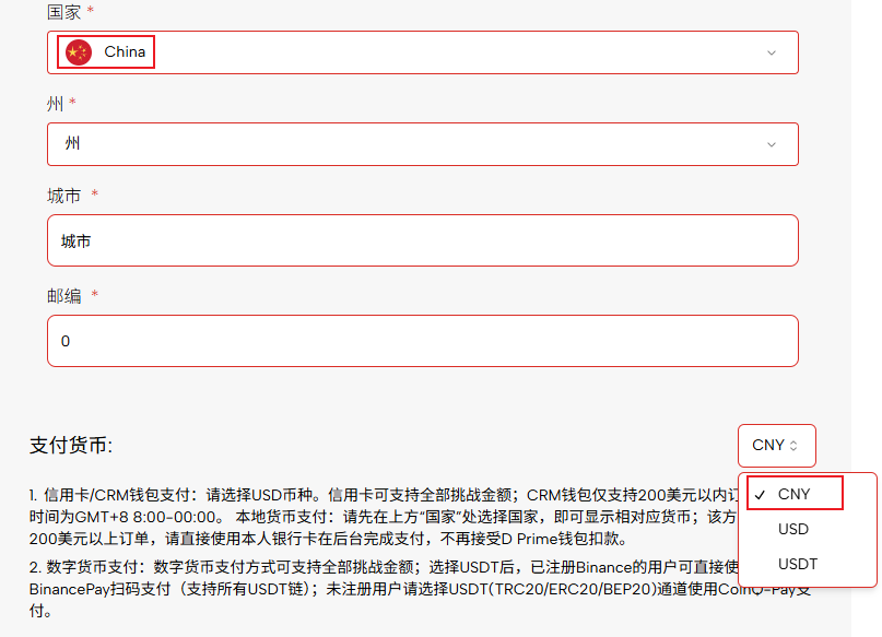 • En la página de pago "nación" Seleccione el país y el estado de la moneda en la que desea pagar y Moneda de pago Seleccione la moneda correspondiente en el menú desplegable (por ejemplo,Año Nuevo Chino).