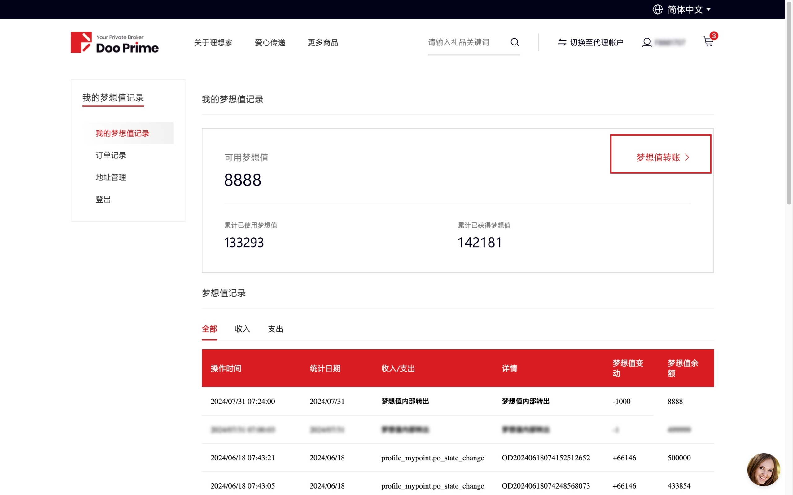 Sus Dream Points se pueden transferir entre clientes individuales con el mismo nombre o cuentas de agentes con el mismo nombre y usarse para canjear regalos o servicios proporcionados en el centro comercial, pero no se pueden transferir, descontar ni intercambiar con otros clientes.