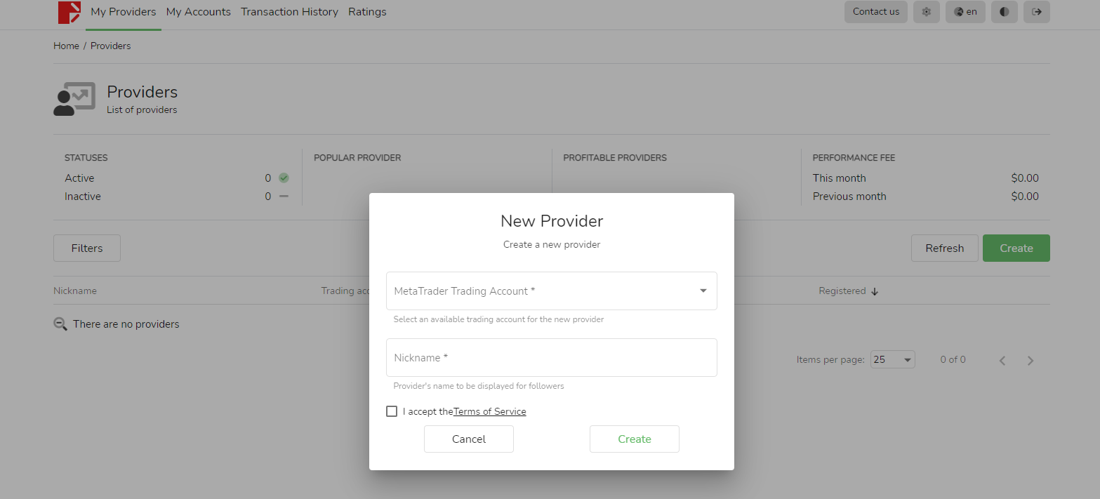 En la página [Mi cuenta] de la fuente de la señal, puede agregar una nueva cuenta comercial haciendo clic en el botón verde [Crear]. Sin embargo, esta cuenta no se puede utilizar para iniciar sesión y solo se puede seleccionar como fuente de señal, seguidor o configurada para recibir tarifas de rendimiento.