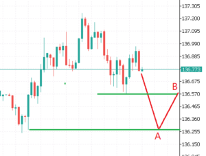 c) Cuando el precio del USDJPY toca la línea A a la baja, se activa la orden Sell Limit en la línea B, y cuando el precio rebota de la línea A a la línea B, se ejecuta una orden Sell al precio de la línea B;
