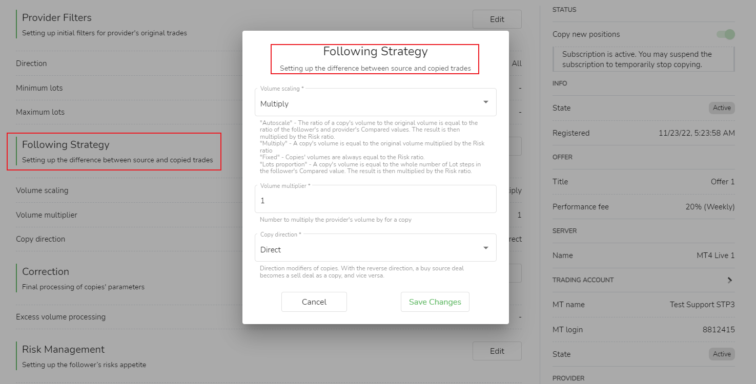 - 카피 계정의 만기 포지션은 시그널 소스 계정의 거래량에 거래량 승수를 곱한 것과 같습니다.