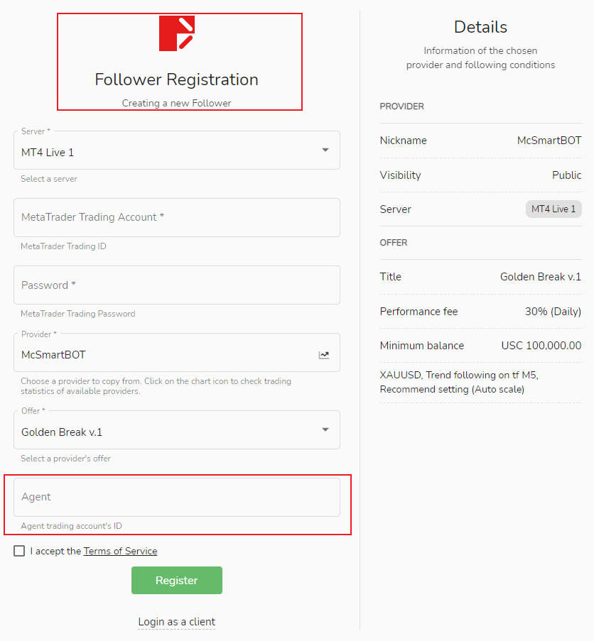 사용자가 팔로워로 등록할 때 소개 프로모터를 추가하려면 등록 페이지에서 소개 프로모션의 MetaTrader 거래 계정을 입력하기만 하면 됩니다.