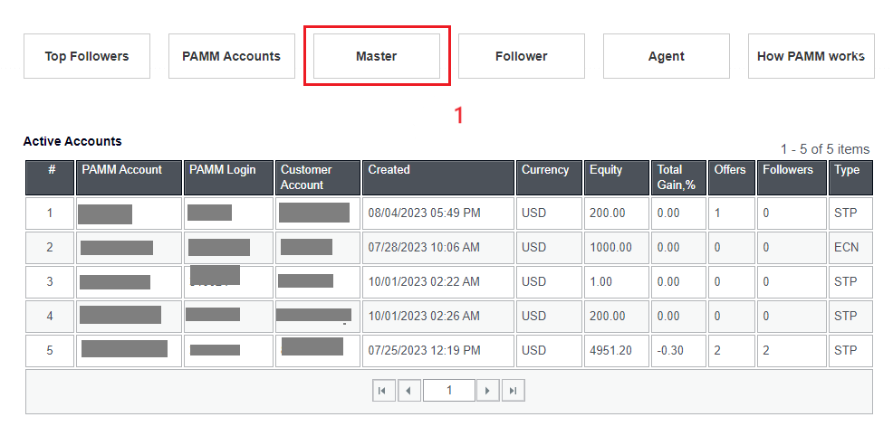 b. 새 PAMM 계정이 성공적으로 생성되면 사용자는 "마스터" 페이지의 "활성 계정" 섹션에서 생성된 계정을 볼 수 있습니다.