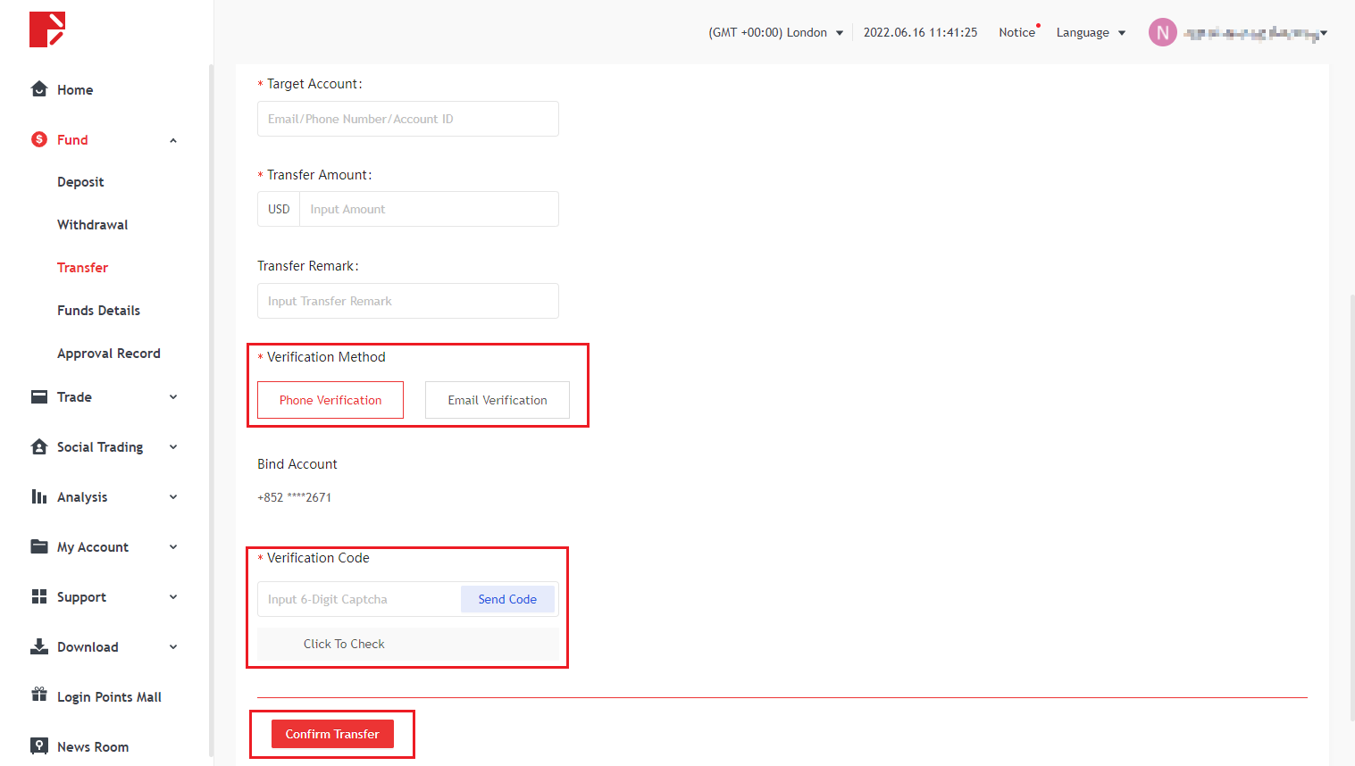 Selecione a conta de transferência, insira a conta de transferência e o valor da transferência. Para verificação de segurança via celular ou e-mail, clique em "Enviar código de verificação" e insira o código de verificação. Por fim, clique em Confirmar Transferência.