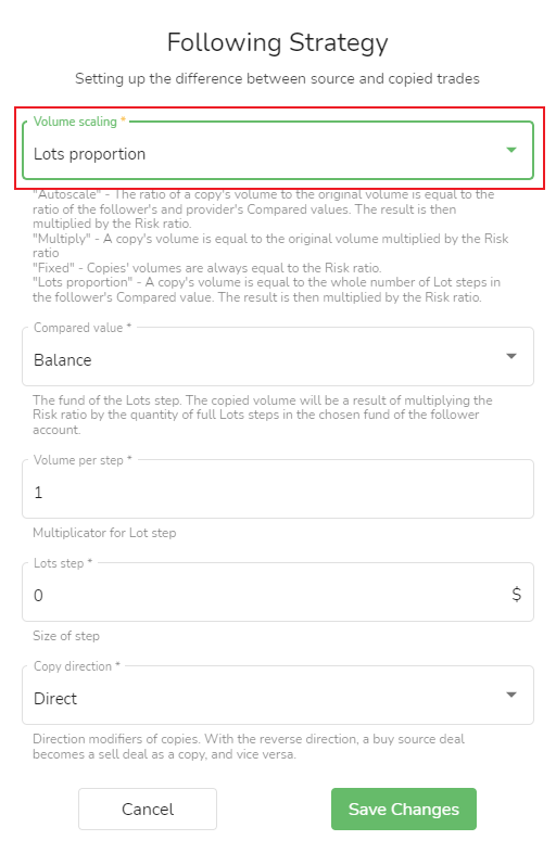 O volume da cópia comercial depende do saldo atual ou patrimônio da conta do seguidor. Os seguidores podem ajustar o volume de negociação de cópias de acordo com o saldo atual da conta ou valor líquido para controlar o risco de cópia