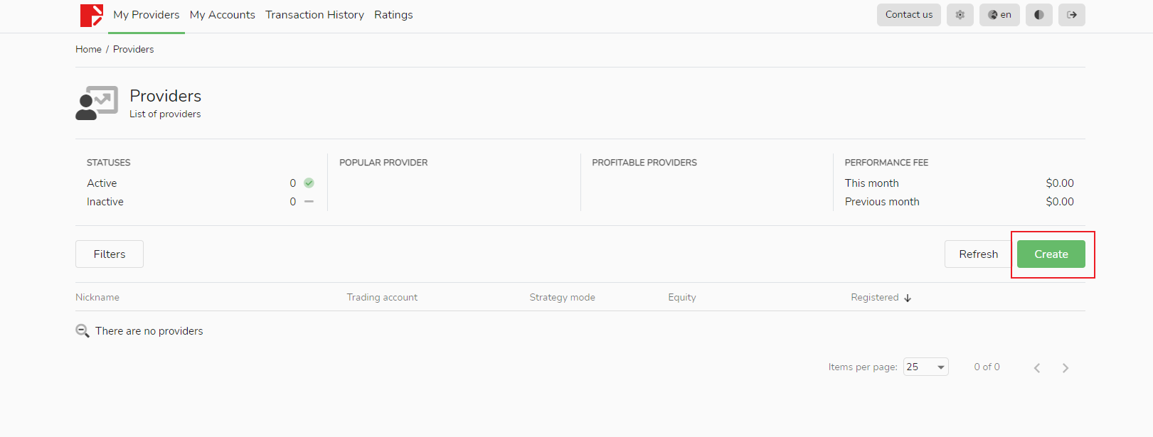 Na página [Minha conta] da fonte do sinal, você pode adicionar uma nova conta de negociação clicando no botão verde [Criar]. No entanto, esta conta não pode ser usada para fazer login e só pode ser selecionada como fonte de sinal, seguidora ou configurada para receber taxas de desempenho.