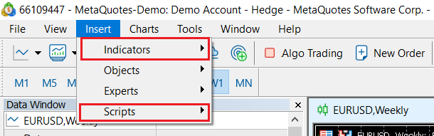 O MT5 vem com até 38 indicadores técnicos que foram escritos, e os traders podem configurá-los independentemente e usá-los a qualquer momento; clique em [Inserir] na barra de menu e na opção [Inserir], selecione [Indicador] ou [Script] e, em seguida, basta clicar em Adicionar.