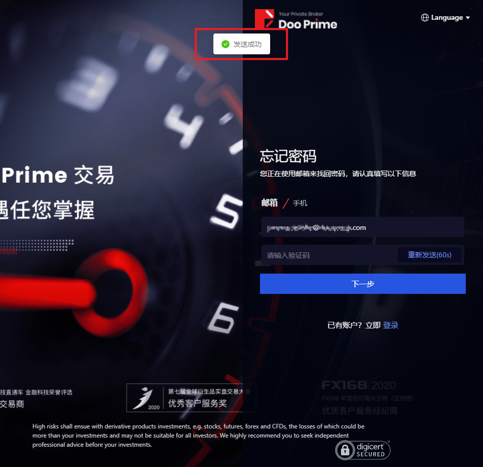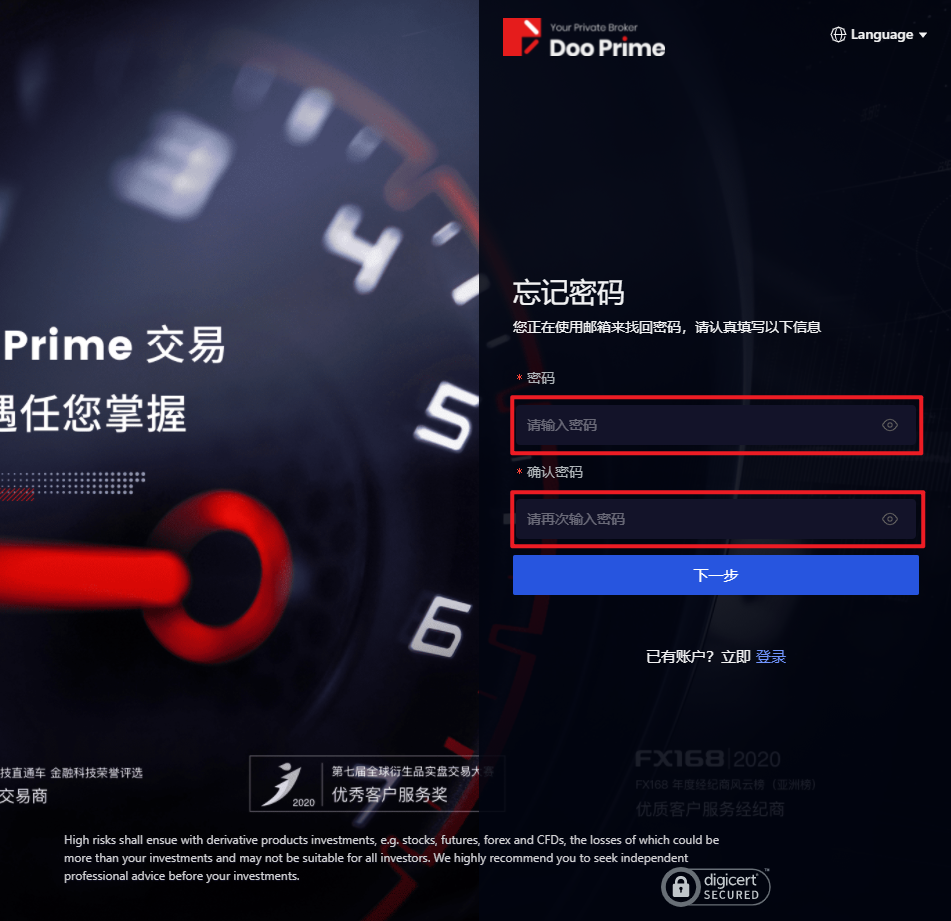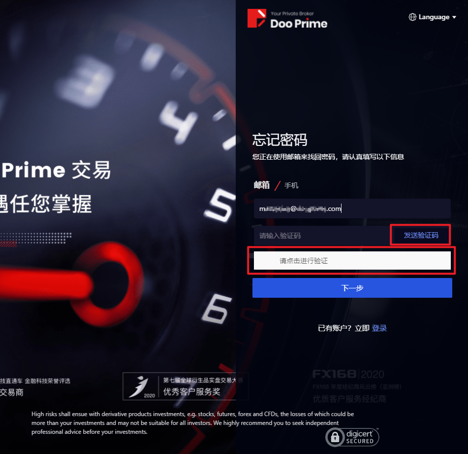 3. 页面会跳至「忘记密码」界面,重设 D Prime 用戶中心的账户密码,点击「下一步」。