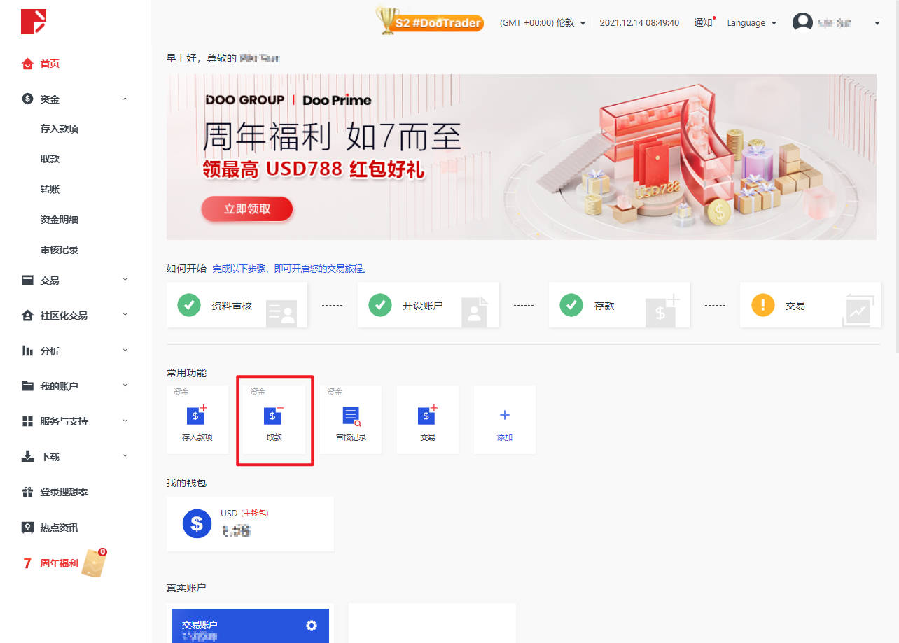 登录进入Doo Prime 用户中心首页后,在「常用功能」一栏点击「取款」。