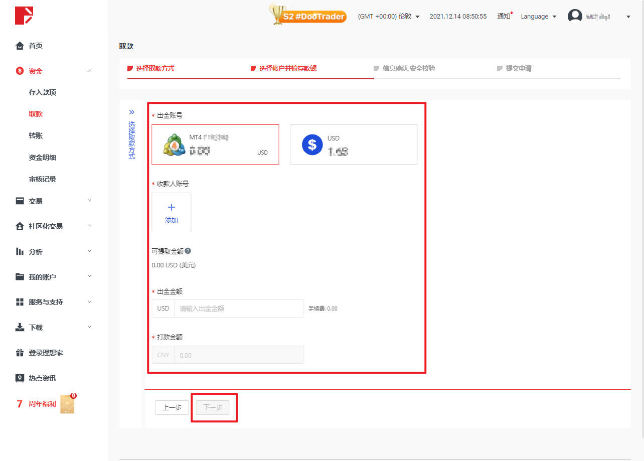 选择取款账号和收款人账号,填写取款金额(美金),完成后点击「下一步」。