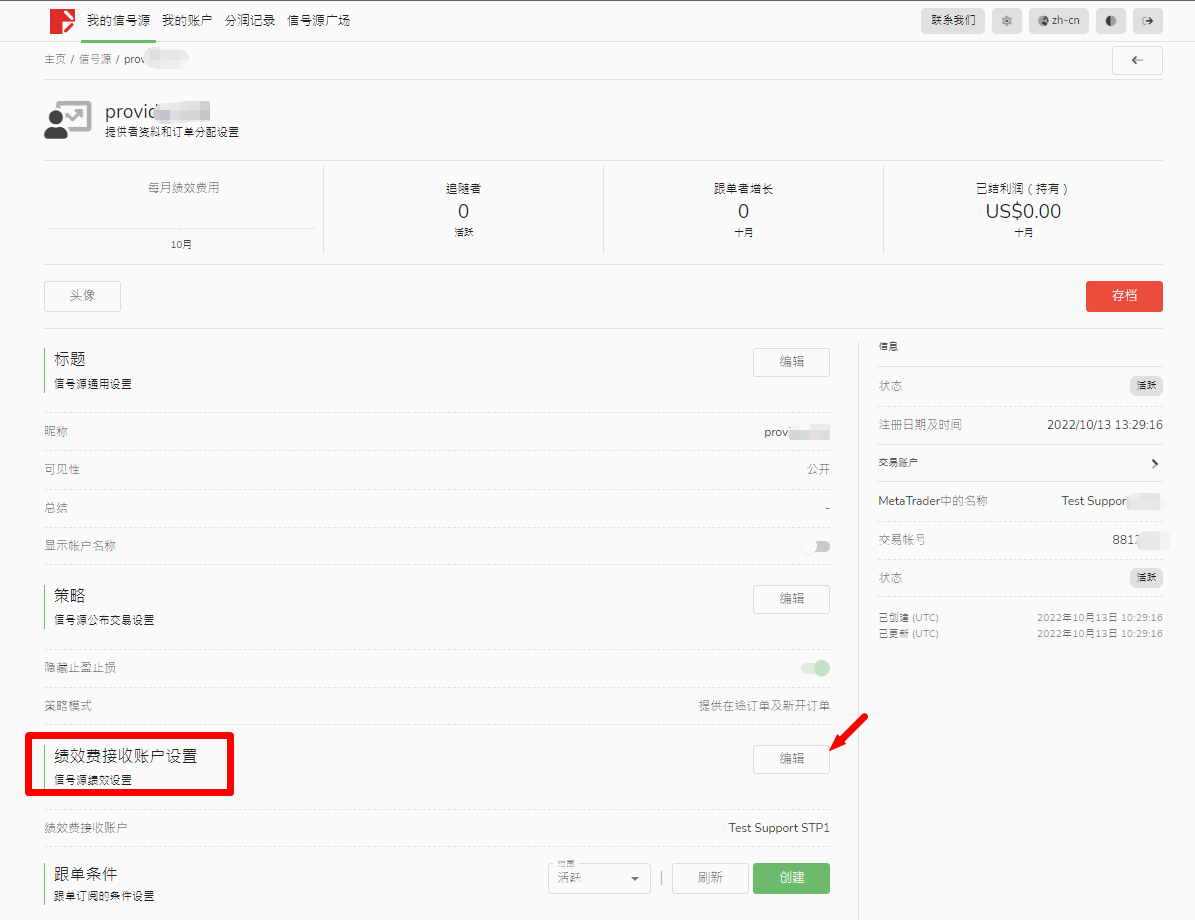 - 在「我的信號源」欄目下,選擇「績效費接收賬戶設置」,點擊「編輯」按鈕。