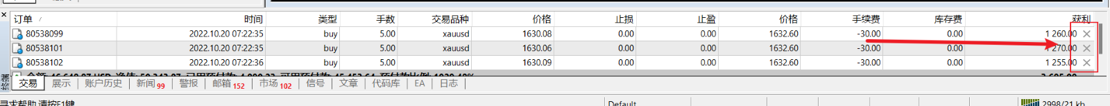 查看方式:在MT4 底部菜單欄選擇「交易」後查看持倉訂單末尾如果顯示x說明你目前是使用投資密碼(觀摩密碼) 登錄賬戶