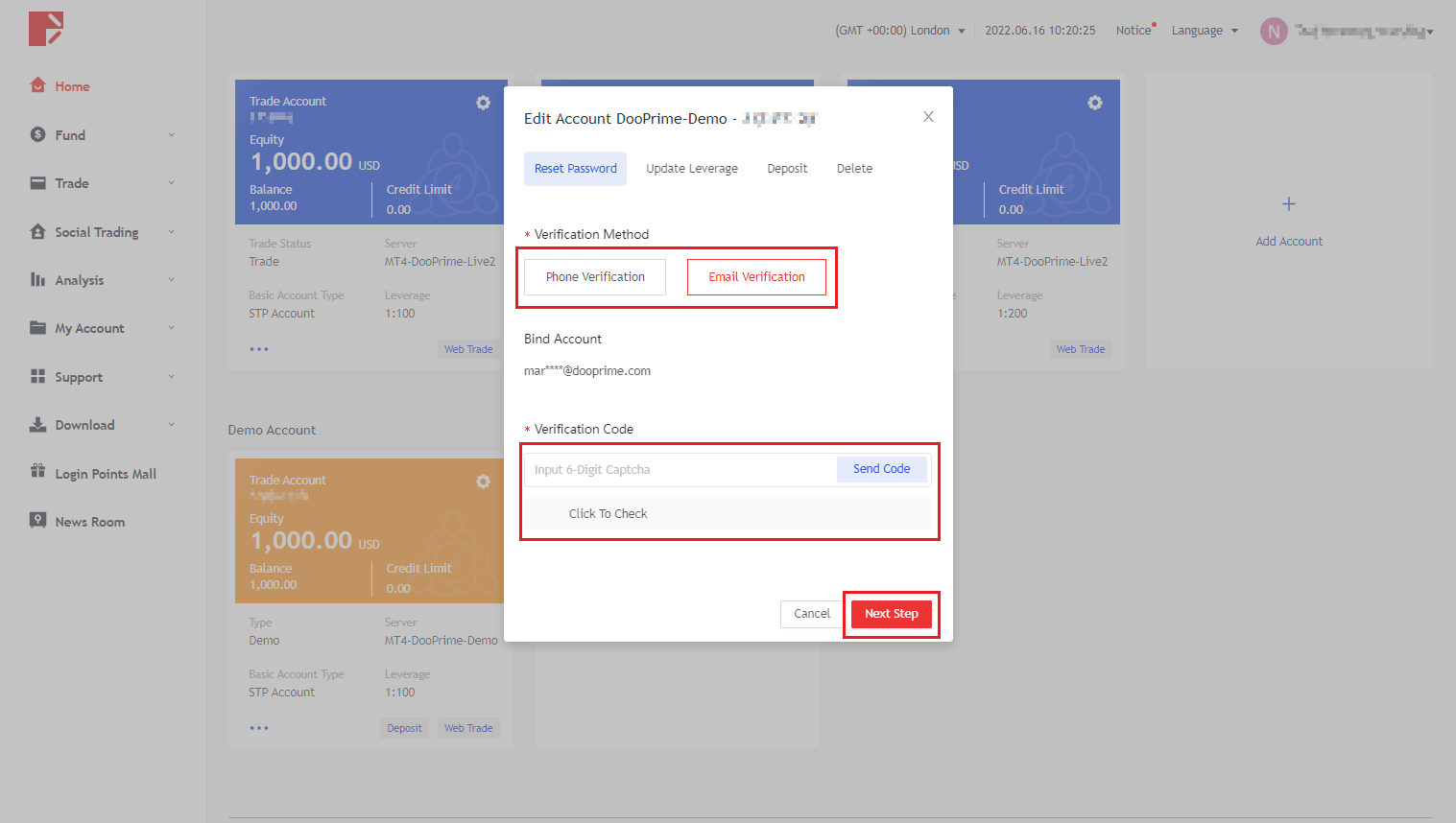2. Nhấp vào "Đặt lại mật khẩu", chọn "Xác minh di động" hoặc "Xác minh email", nhấp vào Xác minh và nhấp vào "Tiếp theo" sau khi nhận được mã xác minh.