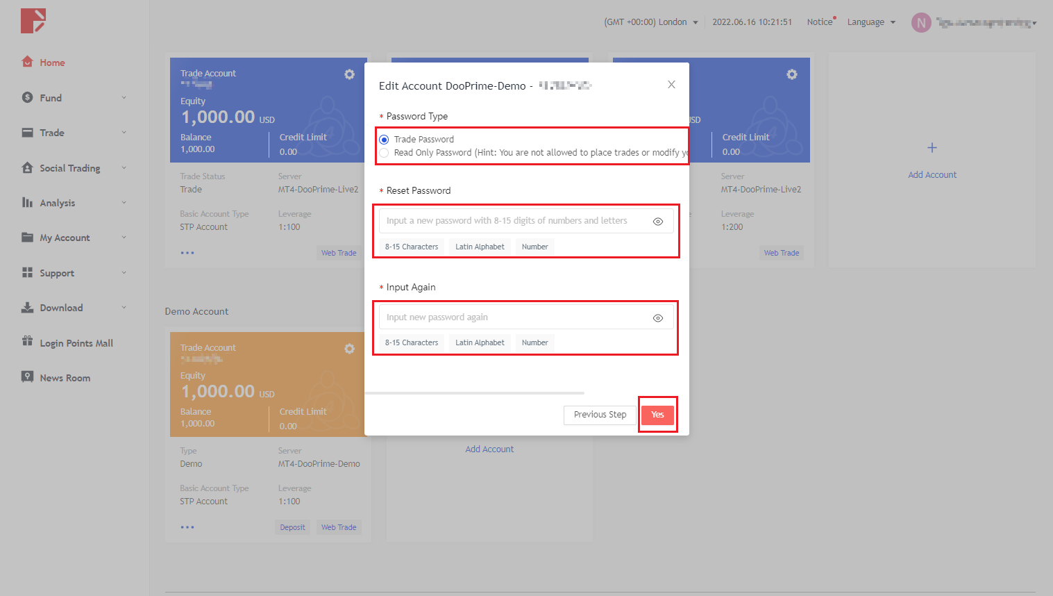 Tôi phải làm gì nếu quên mật khẩu tài khoản demo trong Trung tâm người dùng D Prime?