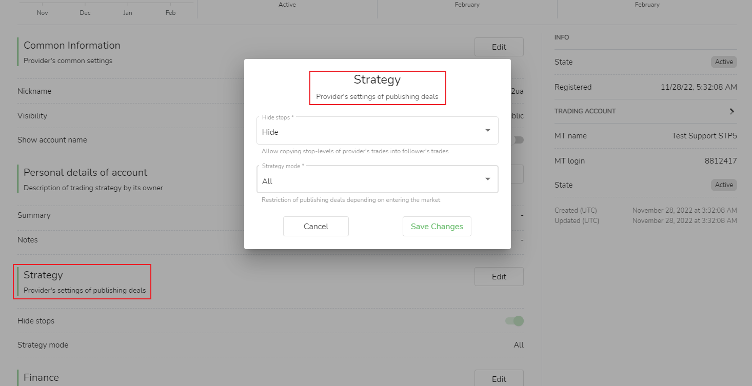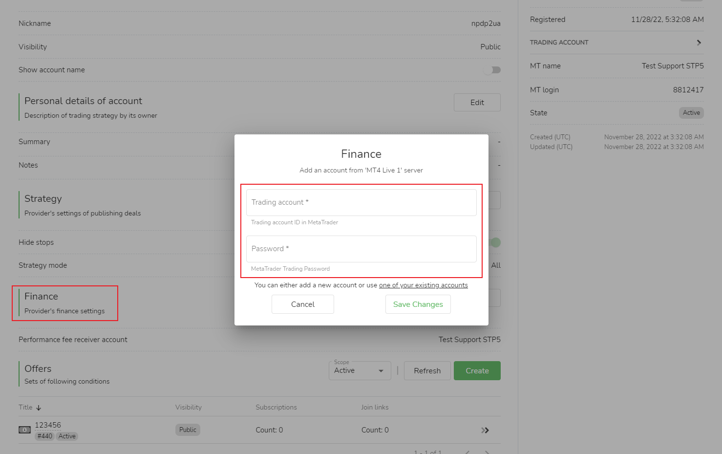 Tài khoản chấp nhận phí hiệu suất:Tài khoản giao dịch mà nguồn tín hiệu thu thập người theo dõi để trả phí hiệu suất cho nguồn tín hiệu có thể chọn tài khoản hiện có hoặc thêm tài khoản mới. Trong quá trình thêm tài khoản mới, bạn cần điền vào tài khoản giao dịch (nghĩa là tài khoản giao dịch trong MetaTrader) và mật khẩu (nghĩa là Mật khẩu giao dịch MetaTrader) và sau đó nhấp vào [Lưu thay đổi] để hoàn tất cài đặt thành công.